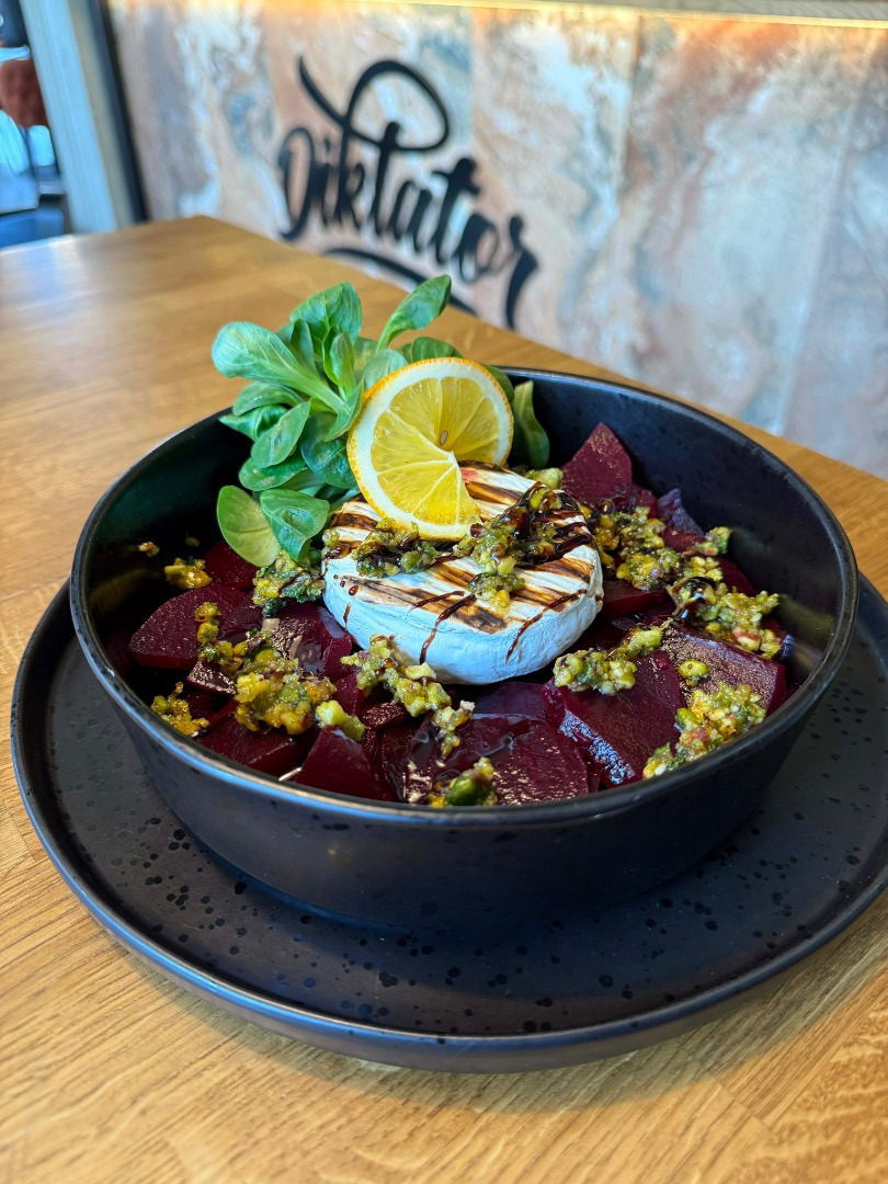 Šalát z pečenej repy, grilovaný hermelín s pistáciovou gremolatou