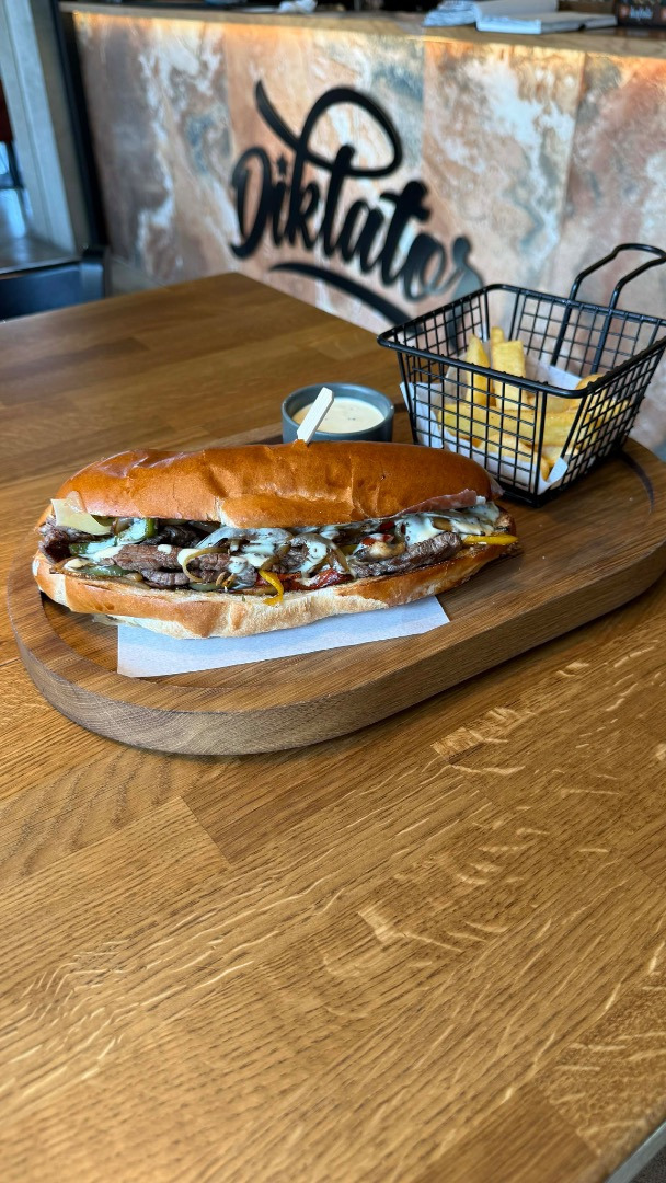 90g 100% odležaný hovädzí chuck roll, 90g trhané bravčové mäso, sweet chilli mayo, naše nakladané uhorky s cibuľou, slanina, syr volovec, (jemne pikantné)